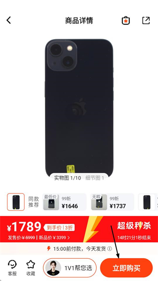4、在商品詳情頁面,點擊立即購買,可完成手機購買操作。