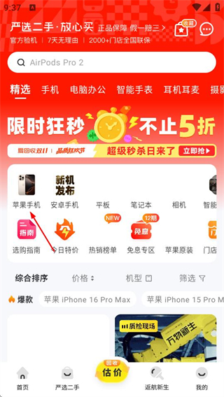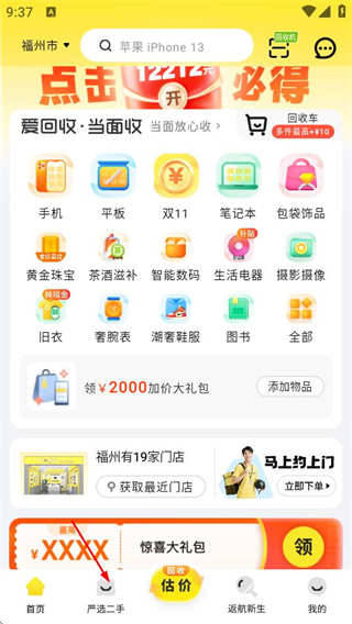 1、打開愛回收,在首頁點擊嚴選二手,進入嚴選二手頁面。