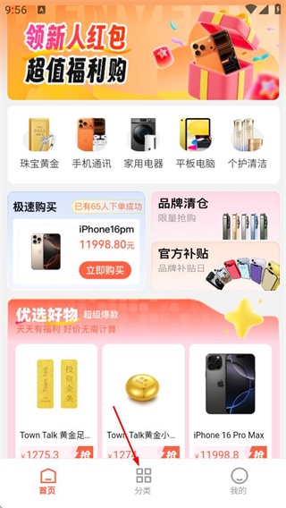 1、打開金谷優(yōu)品,在首頁(yè)點(diǎn)擊分類,進(jìn)入商品分類頁(yè)面。