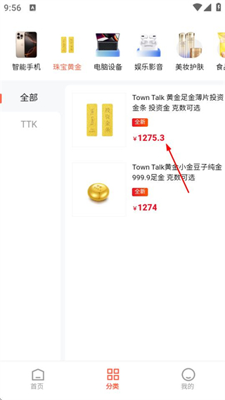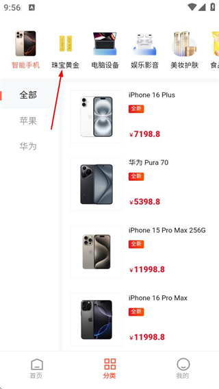 2、在分類頁(yè)面,點(diǎn)擊珠寶黃金分類,進(jìn)入珠寶黃金商品列表頁(yè)面。