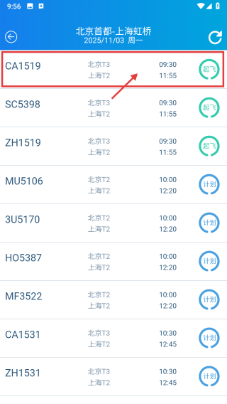 4、在航班信息列表頁(yè)面,即可查看對(duì)應(yīng)航班信息如CA1519等航班的起降時(shí)間、狀態(tài)等。