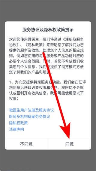 1、打開(kāi)微醫(yī)生,在服務(wù)協(xié)議及隱私權(quán)益政策提示彈窗中,點(diǎn)擊同意。