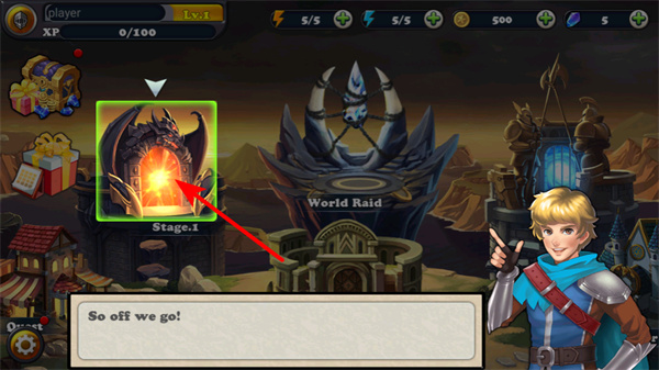 1、進入游戲后,點擊Stage1區(qū)域開啟第一關(guān),這是踏入冒險旅程的關(guān)鍵操作,準確點擊可進入戰(zhàn)斗場景。