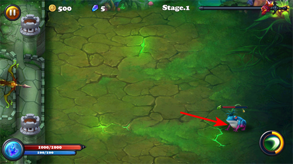 2、在關(guān)卡中,操控角色攻擊藍色蛙類敵人,敵人是獲取經(jīng)驗和金幣的來源,持續(xù)攻擊可提升角色等級。