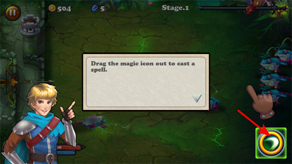 3、拖動右側(cè)魔法圖標(biāo)釋放法術(shù),法術(shù)是強力攻擊手段,合理使用可快速清理大量敵人,助力關(guān)卡推進。