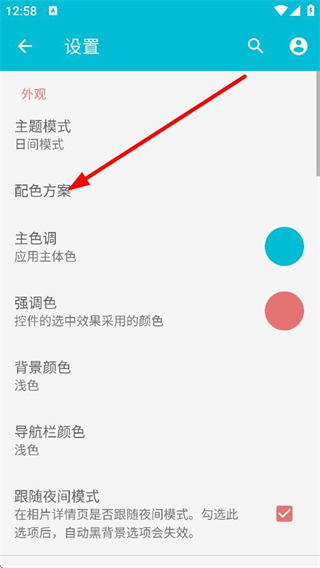 3、在設(shè)置頁(yè)面,點(diǎn)擊配色方案,進(jìn)入配色方案選擇頁(yè)面。