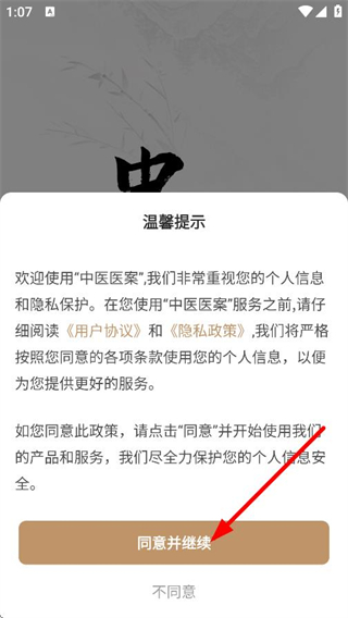 1、在溫馨提示的彈窗中,點(diǎn)擊同意并繼續(xù),進(jìn)入APP首頁(yè)。