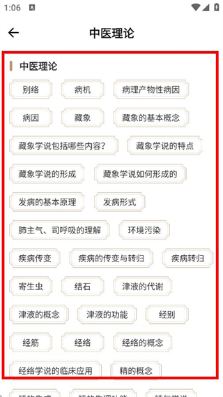 4、在中醫(yī)理論分類頁(yè)面,可選擇具體中醫(yī)理論知識(shí)點(diǎn)進(jìn)行查看。