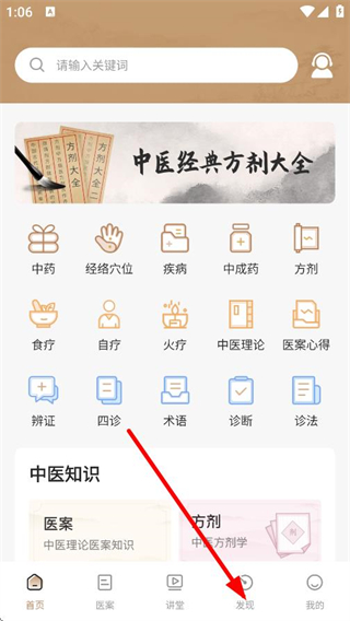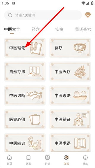 3、在發(fā)現(xiàn)頁(yè)面,點(diǎn)擊中醫(yī)理論,進(jìn)入中醫(yī)理論分類頁(yè)面。