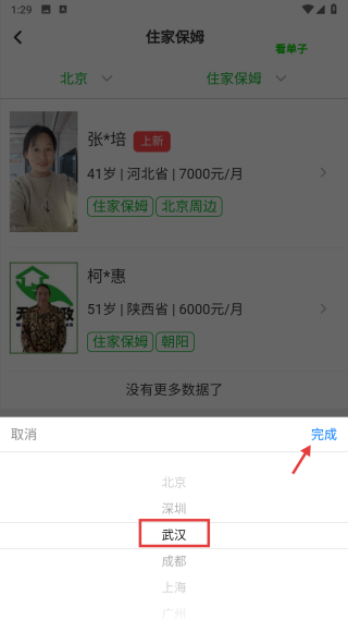 2、在住家保姆頁面,點(diǎn)擊城市選擇區(qū)域,將城市切換為武漢,點(diǎn)擊完成。