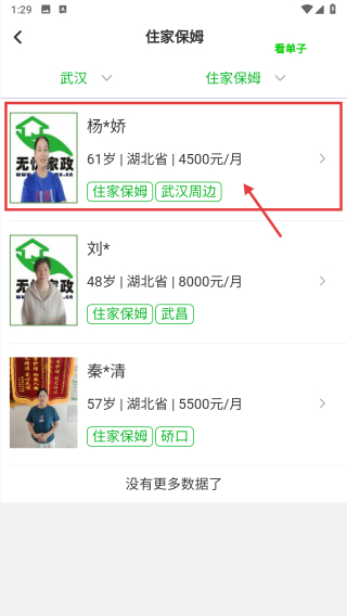 3、在武漢住家保姆列表頁面,點(diǎn)擊楊*嬌保姆條目,進(jìn)入該保姆的詳細(xì)信息頁面。