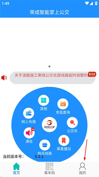 1、打開(kāi)榮成智能掌上公交軟件,點(diǎn)擊右下角“我的”按鈕,進(jìn)入個(gè)人界面。