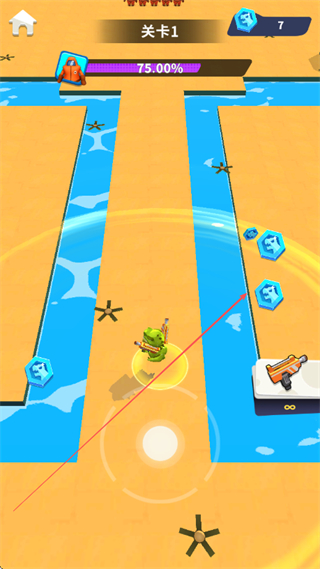 2、持續(xù)靠近敵人,自動(dòng)射擊消滅它們,同時(shí)收集藍(lán)色寶石,提升關(guān)卡完成度。