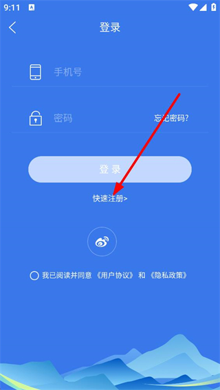 3、在登錄頁面,點擊快速注冊,進入手機號注冊頁面。