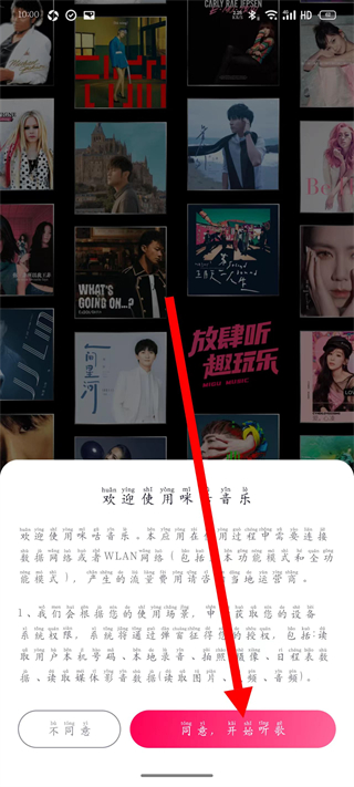 1、打開咪咕音樂,在彈窗中點擊同意并試聽。