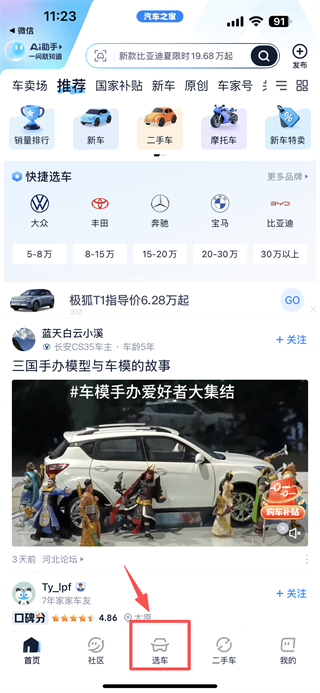 1、打開汽車資訊類APP首頁,點(diǎn)擊底部選車選項(xiàng),進(jìn)入選車頁面。