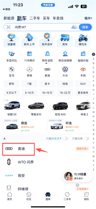 2、在選車頁面,點(diǎn)擊奧迪品牌,進(jìn)入奧迪車型列表頁面。