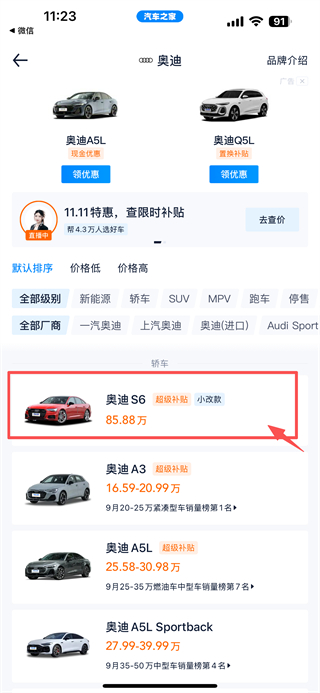 3、在奧迪車型列表頁面,點(diǎn)擊奧迪S6車型條目,進(jìn)入車型詳情頁面。