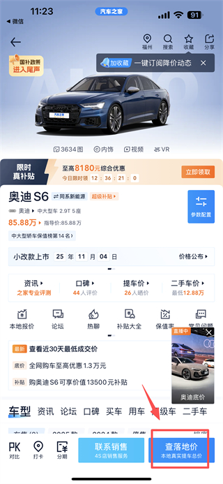 4、在車型詳情頁面,點(diǎn)擊查落地價(jià)按鈕,即可查詢?cè)撥囆偷谋镜卣鎸?shí)提車總價(jià)。