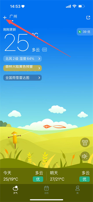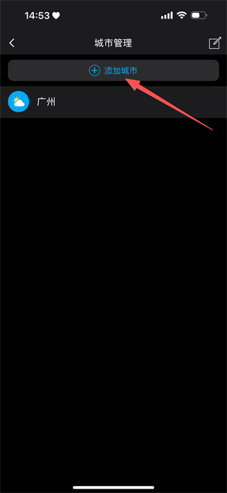 1、在天氣頁(yè)面,點(diǎn)擊左上角+,進(jìn)入城市管理頁(yè)面。