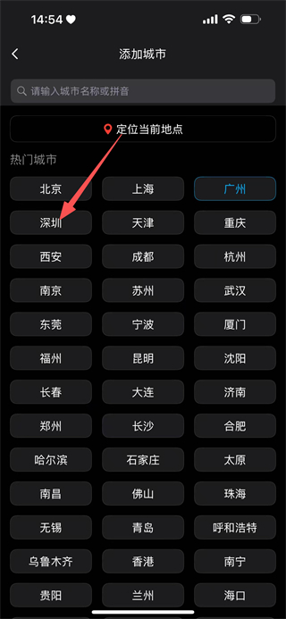 3、隨后我們可以在添加城市頁(yè)面,點(diǎn)擊深圳,選擇該城市。