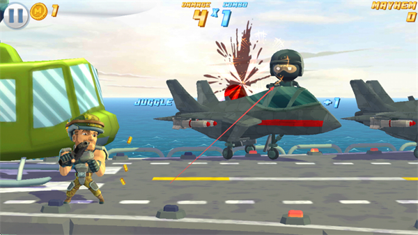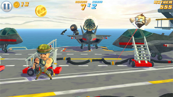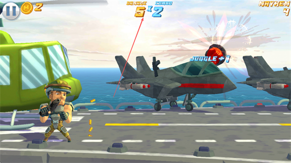 1、在航母場(chǎng)景中,操控角色射擊敵方戰(zhàn)機(jī),命中后觸發(fā)爆炸,積累傷害值和金幣。