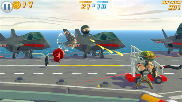 3、移動(dòng)角色到不同區(qū)域,射擊更多戰(zhàn)機(jī)和敵人,收集金幣,提升MAYHEM值。