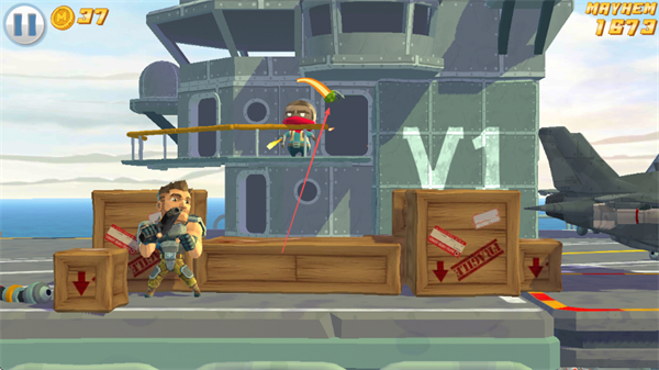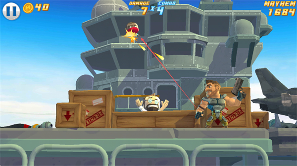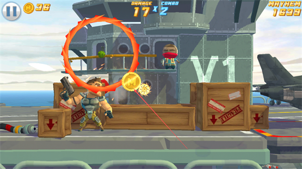 1、在航母場(chǎng)景中,操控角色射擊敵人,命中后收集金幣,積累傷害值和連擊數(shù)。
