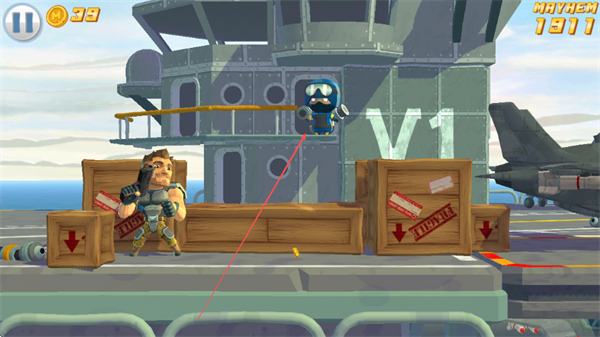 3、移動(dòng)角色到場(chǎng)景不同區(qū)域,射擊多樣敵人,收集金幣,提升MAYHEM值。