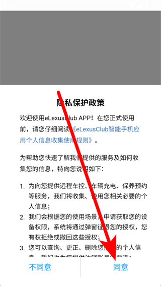 1、打開雷克薩斯,在隱私保護(hù)政策彈窗中,點(diǎn)擊同意。