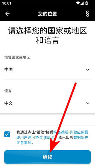 3、選擇國家或地區(qū)和語言,勾選同意相關(guān)協(xié)議后,點擊繼續(xù)。