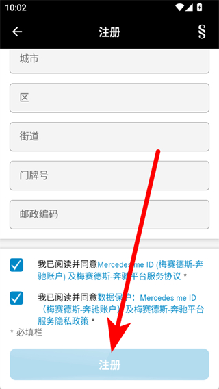 4、填寫城市、郵政編碼等注冊信息,勾選同意后,點擊注冊按鈕,完成賬號注冊流程。