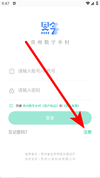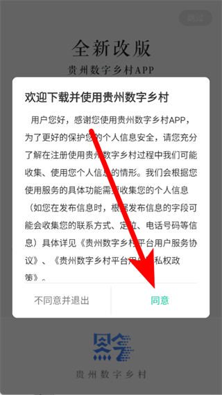 1、打開(kāi)貴州數(shù)字鄉(xiāng)村,在彈窗中點(diǎn)擊同意,進(jìn)入登錄注冊(cè)頁(yè)面。