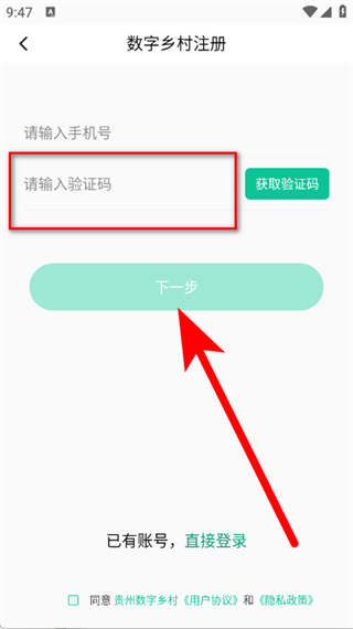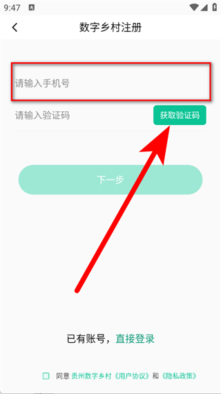3、在數(shù)字鄉(xiāng)村注冊(cè)頁(yè)面,輸入手機(jī)號(hào),點(diǎn)擊獲取驗(yàn)證碼。