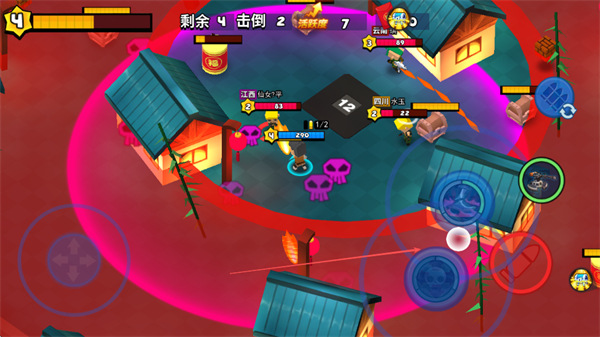 3、在縮圈區(qū)域內(nèi)與其他玩家對(duì)戰(zhàn),靈活走位,利用技能和道具消滅對(duì)手。