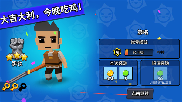 4、獲得第1名后,領(lǐng)取帳號(hào)經(jīng)驗(yàn)、金幣、綠寶石等獎(jiǎng)勵(lì),點(diǎn)擊繼續(xù),繼續(xù)游戲。