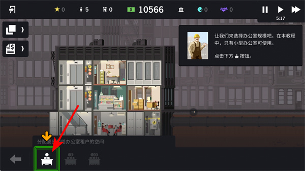 1、在游戲中,點(diǎn)擊小型辦公室模塊,這是規(guī)劃辦公空間的關(guān)鍵操作,點(diǎn)擊后可選擇合適的辦公室規(guī)模,為租戶提供辦公區(qū)域。