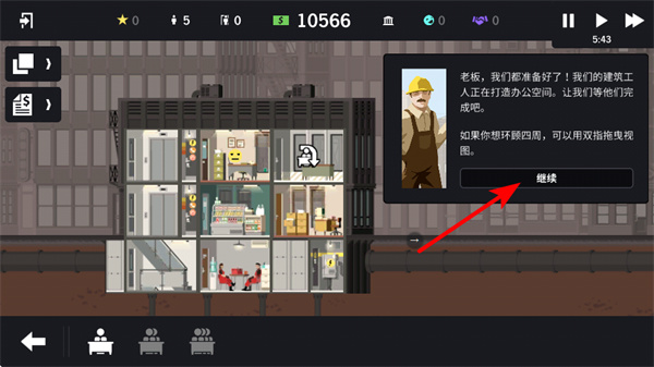 3、點(diǎn)擊繼續(xù)按鈕推進(jìn)建筑進(jìn)程,繼續(xù)操作是完成辦公空間建設(shè)后的關(guān)鍵環(huán)節(jié),點(diǎn)擊后可等待建筑工人完成施工,開啟建筑任務(wù)。