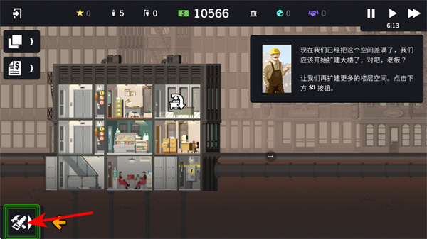 4、點(diǎn)擊建筑工具按鈕,工具選擇是開展大樓擴(kuò)建的重要操作,點(diǎn)擊后可進(jìn)入建筑功能界面,選擇擴(kuò)建樓層等操作,拓展空間容量。