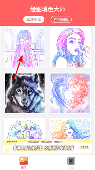 1、在游戲中,選擇本地圖庫中的繪圖作品,這是開啟填色創(chuàng)作的關(guān)鍵操作,選擇后可進(jìn)入具體的填色界面,開始藝術(shù)創(chuàng)作。