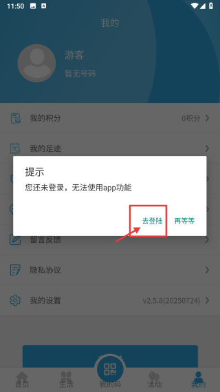 3、在提示彈窗中,點擊去登陸選項,進(jìn)入賬號登錄界面。