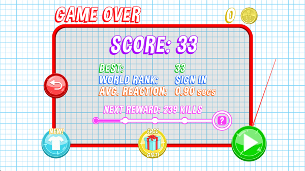 4、若游戲失敗GAMEOVER,可點擊綠色繼續(xù)按鈕重新挑戰(zhàn),爭取突破最高分BEST,提升世界排名WORLDRANK。