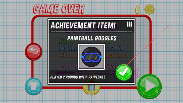 4、游戲失敗后,達(dá)成成就可領(lǐng)取獎勵,如PaintballGoggles,點(diǎn)擊繼續(xù)按鈕重新挑戰(zhàn)。