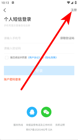 3、在個(gè)人短信登錄頁面,點(diǎn)擊注冊(cè),進(jìn)入注冊(cè)頁面。