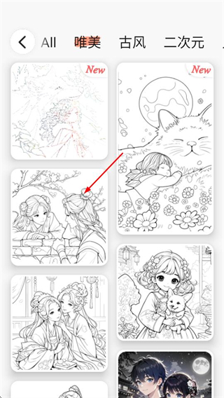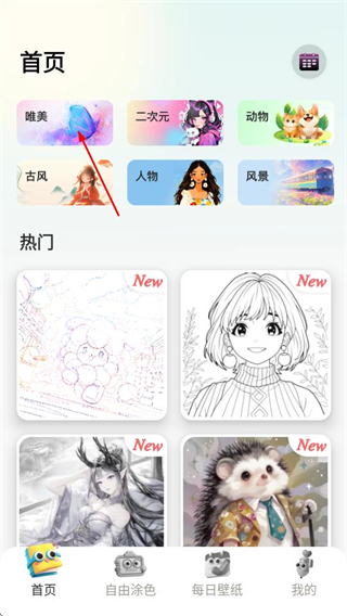 2、在唯美分類頁(yè)面,選擇感興趣的涂色模板,進(jìn)入涂色編輯頁(yè)面。