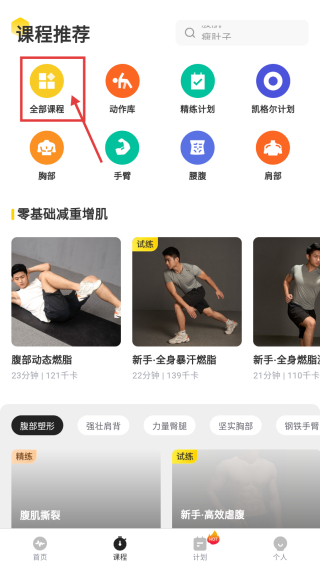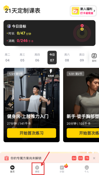 1、打開健身類APP,點擊底部課程選項,進入課程推薦頁面。