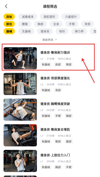 3、在課程篩選頁面,點擊健身房-臀肩耐力強訓課程,進入課程詳情頁。