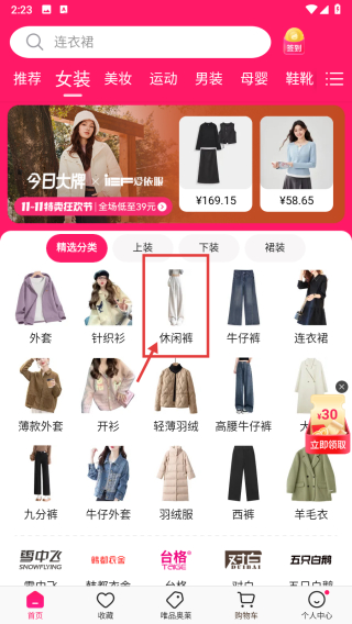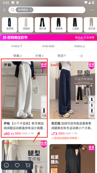 2、在女裝商品專區(qū),點(diǎn)擊休閑褲分類,進(jìn)入休閑褲商品列表頁。