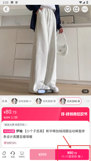 4、在商品詳情頁,點(diǎn)擊¥80.7311.11狂歡價搶按鈕,完成該商品的購買操作。
