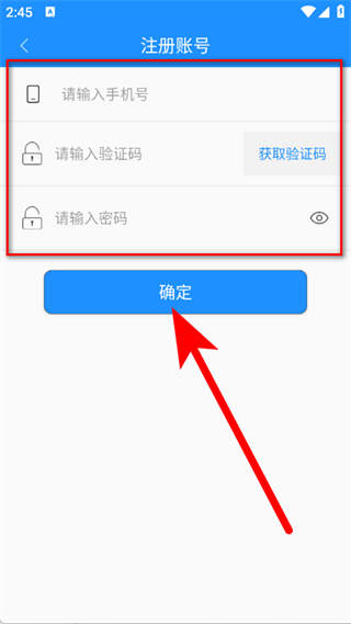 4、輸入手機(jī)號(hào)、驗(yàn)證碼、密碼后,點(diǎn)擊確定,完成注冊(cè)賬號(hào)。